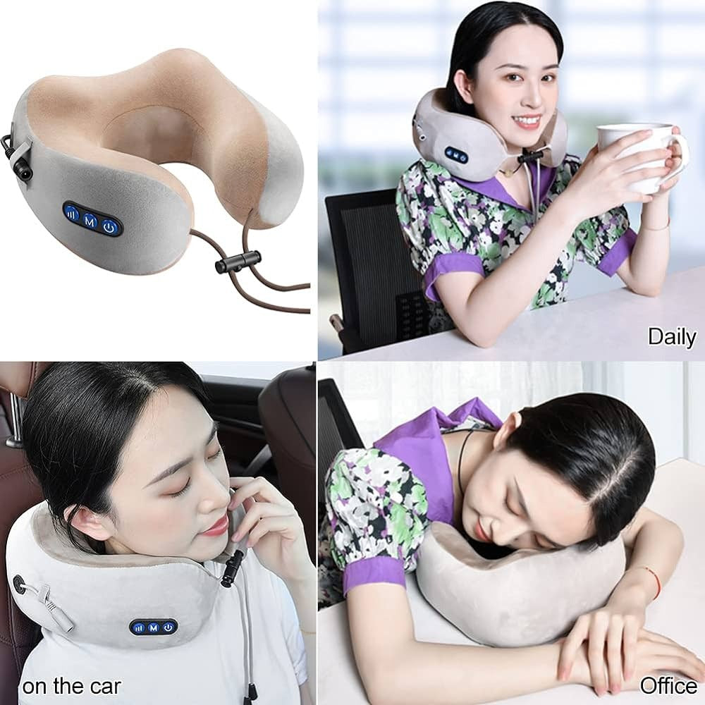 Portátil com modos de vibração e aquecimento, inclui uma polaina para o pescoço. Recarregável por USB, melhora a circulação e relaxa os músculos, ideal para aliviar dores.